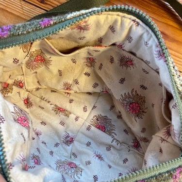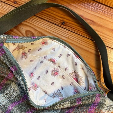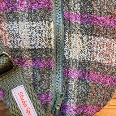 Gemaakt uit wollen rok met paars-groene kleuren. Lichte versteviging zodat je makkelijk alles kan terugvinden.