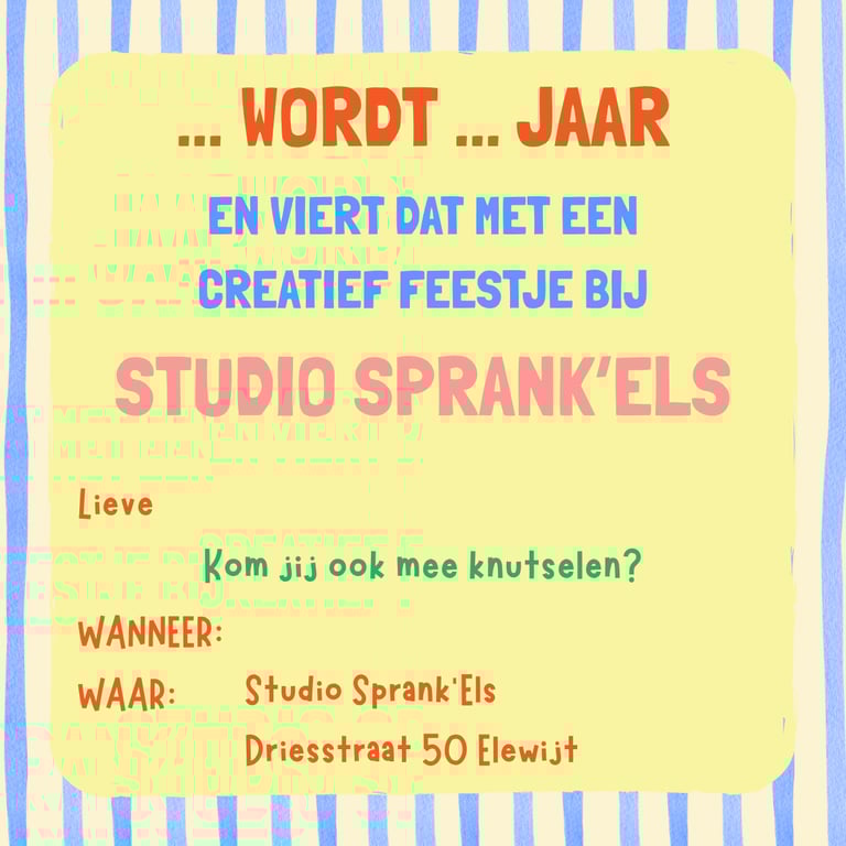 Op zoek naar een origineel en gezellig verjaardagsfeestje waar creativiteit centraal staat? Bij Studio Sprank'Els beleven kinderen een leuke workshop in een warme, huiselijke sfeer. De jarige mag vooraf komen kiezen wat er op het feestje gemaakt wordt. Zo gaat iedereen trots naar huis met een eigen creatie.
