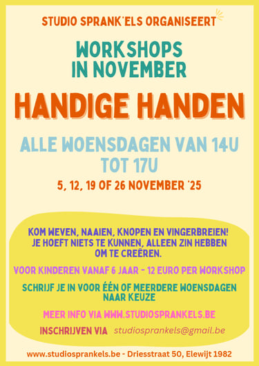 In november doen we gewoon verder met de workshops op woensdagnamiddag. Deze keer staan ze meer in het teken van handvaardigheid. We duiken in de wereld van wol, draad en stof. We weven, naaien, knopen en vingerbreien met wol, stof en hout. Zo ontdekken kinderen hoe leuk het is om iets met hun eigen handen te creëren. Kleine handen, grote makers!